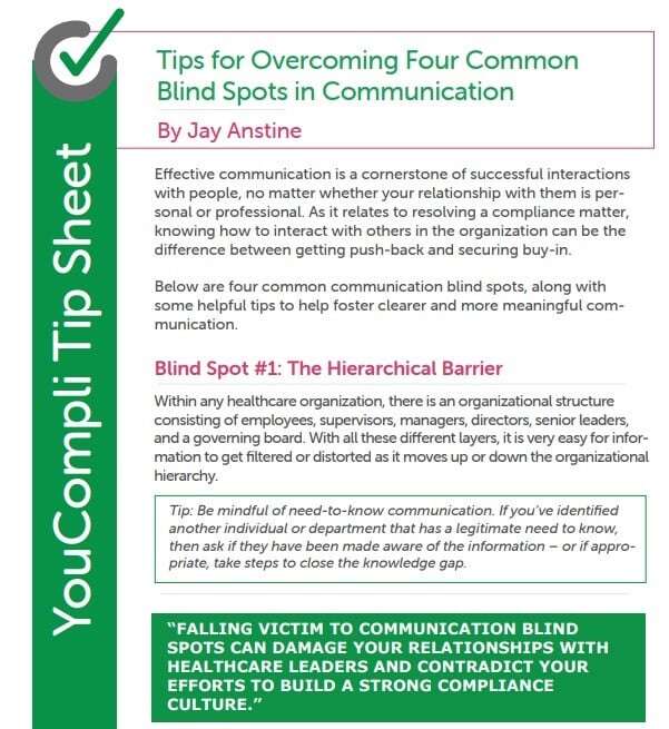 Falling victim to communication blind spots can damage your relationships with healthcare leaders and contradict your efforts to build a strong compliance culture. Because of this, it is important to be mindful of them and address them whenever possible.