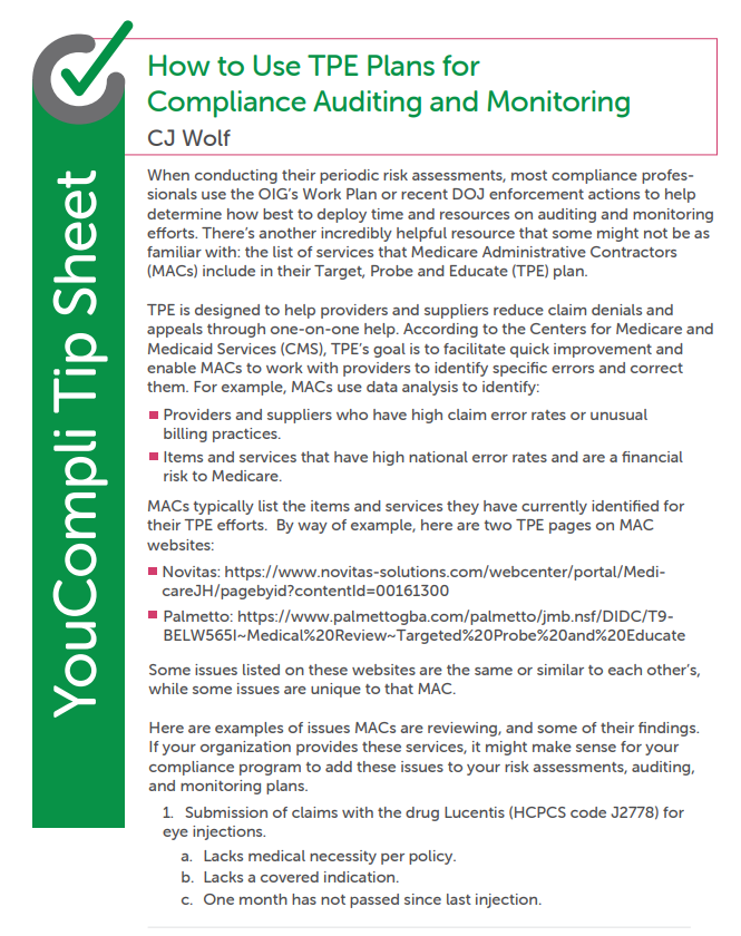 When conducting their periodic risk assessments, most compliance professionals use the OIG’s Work Plan or recent DOJ enforcement actions to help determine how best to deploy time and resources on auditing and monitoring efforts. There’s another incredibly helpful resource that some might not be as familiar with: the list of services that Medicare Administrative Contractors (MACs) include in their Target, Probe and Educate (TPE) plan.
